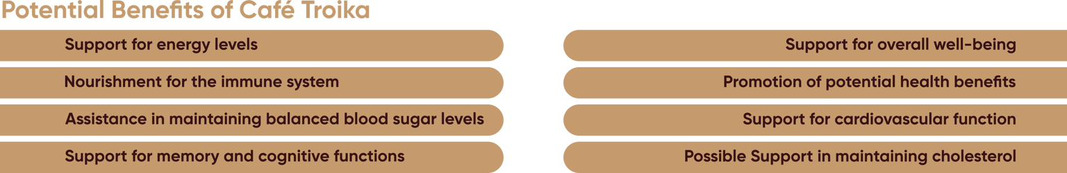 EDMARK Cafe Troika seamlessly combines the invigorating essence of coffee with the added benefits of Ginseng, Tongkat Ali, and Ganoderma. Ginseng, renowned for its medicinal properties, has been scientifically proven to enhance both physical and mental activity. Tongkat Ali, beyond its reputation as an aphrodisiac, is recognized for its role in boosting male testosterone levels.